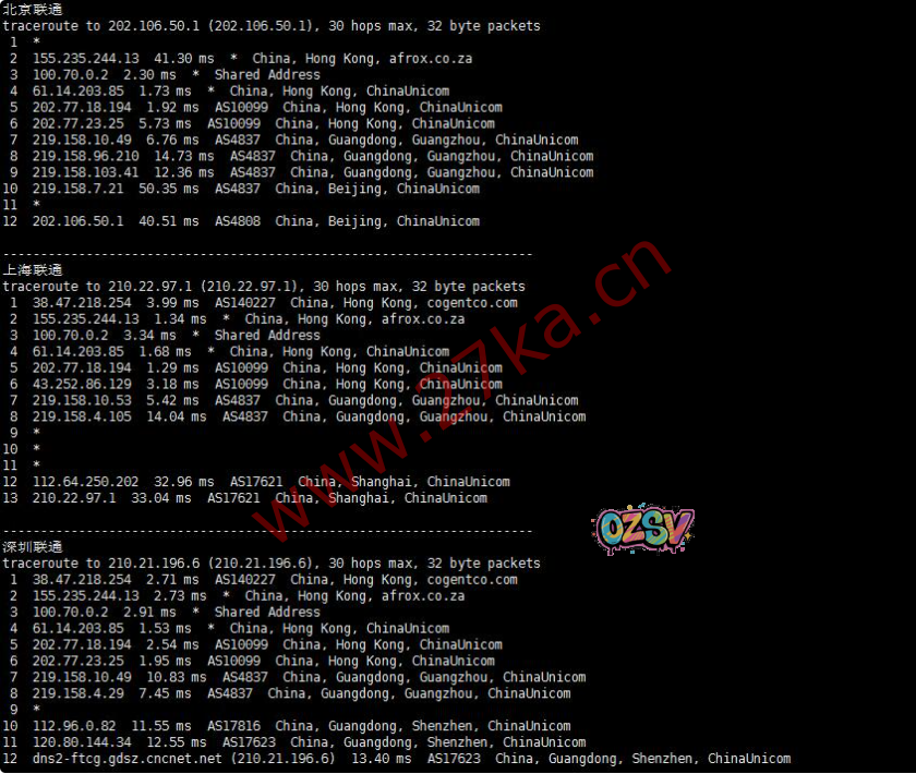联通去程路由是从广州网口出去,然后直连香港机房,走的是AS4837线路。