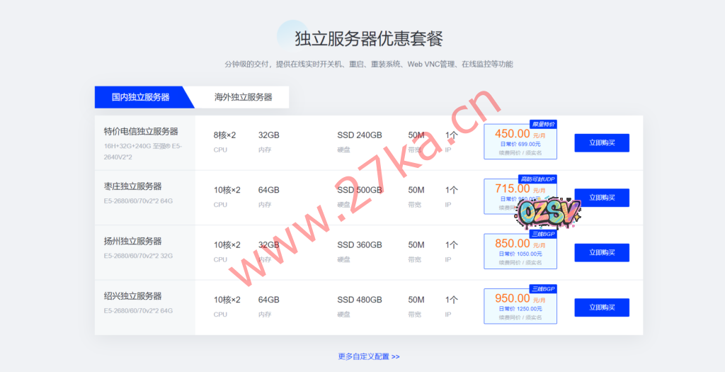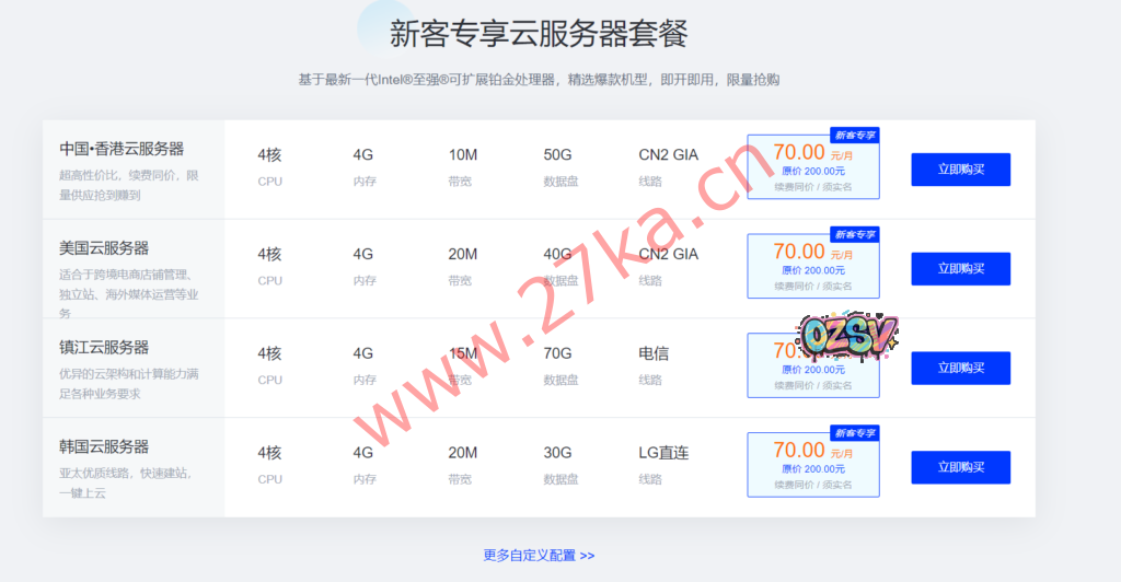 | 香港云服务器 | 4核 | 4G | 10M | 50G | CN2 GIA | 70元/月 |