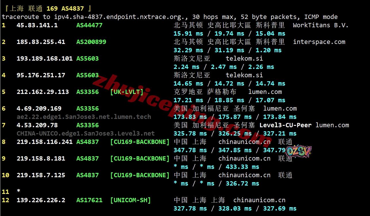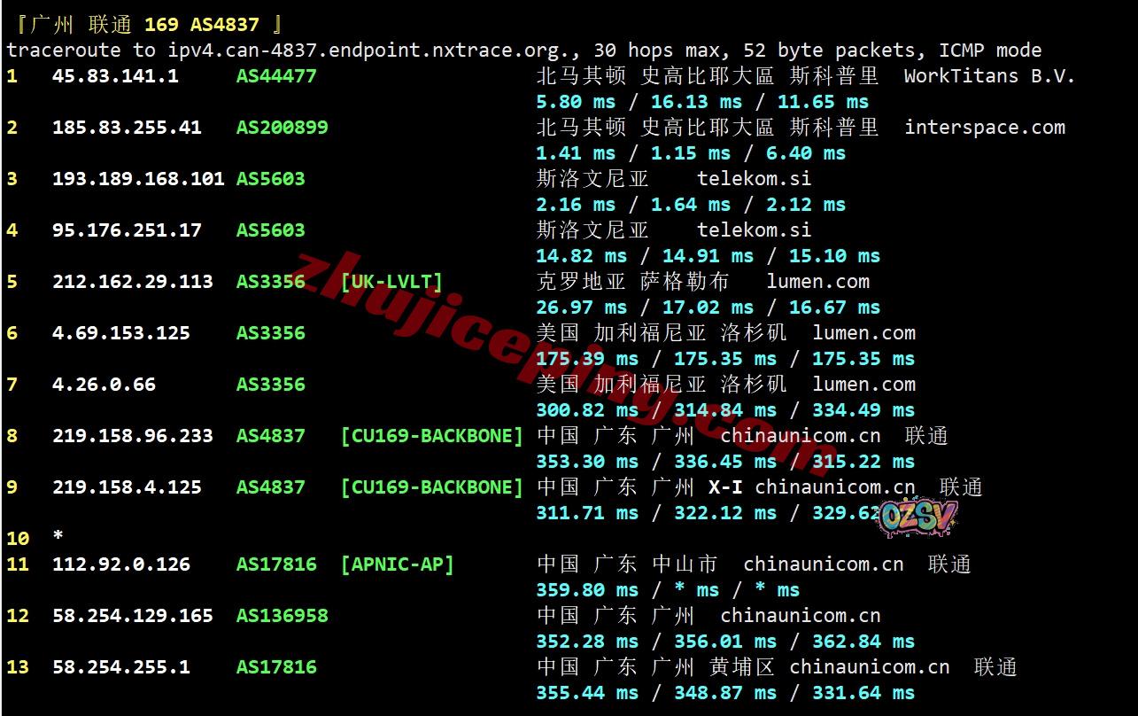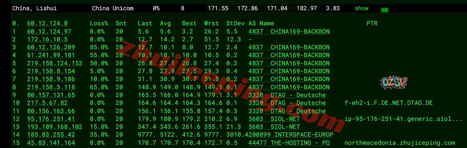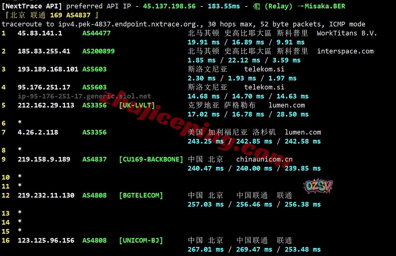 联通去程:直连联通德国法兰克福节点后接接telekom到斯洛文尼亚再去北马其顿
