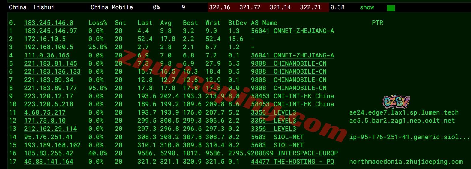 移动去程:直连移动美国洛杉矶节点然后接level3去了克罗地亚再接telekom到北马其顿