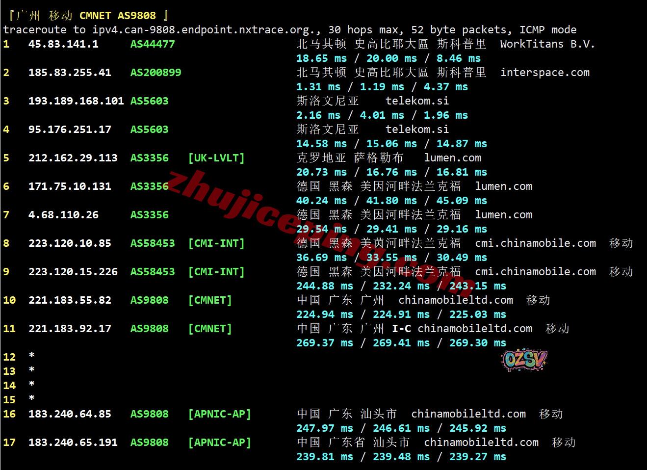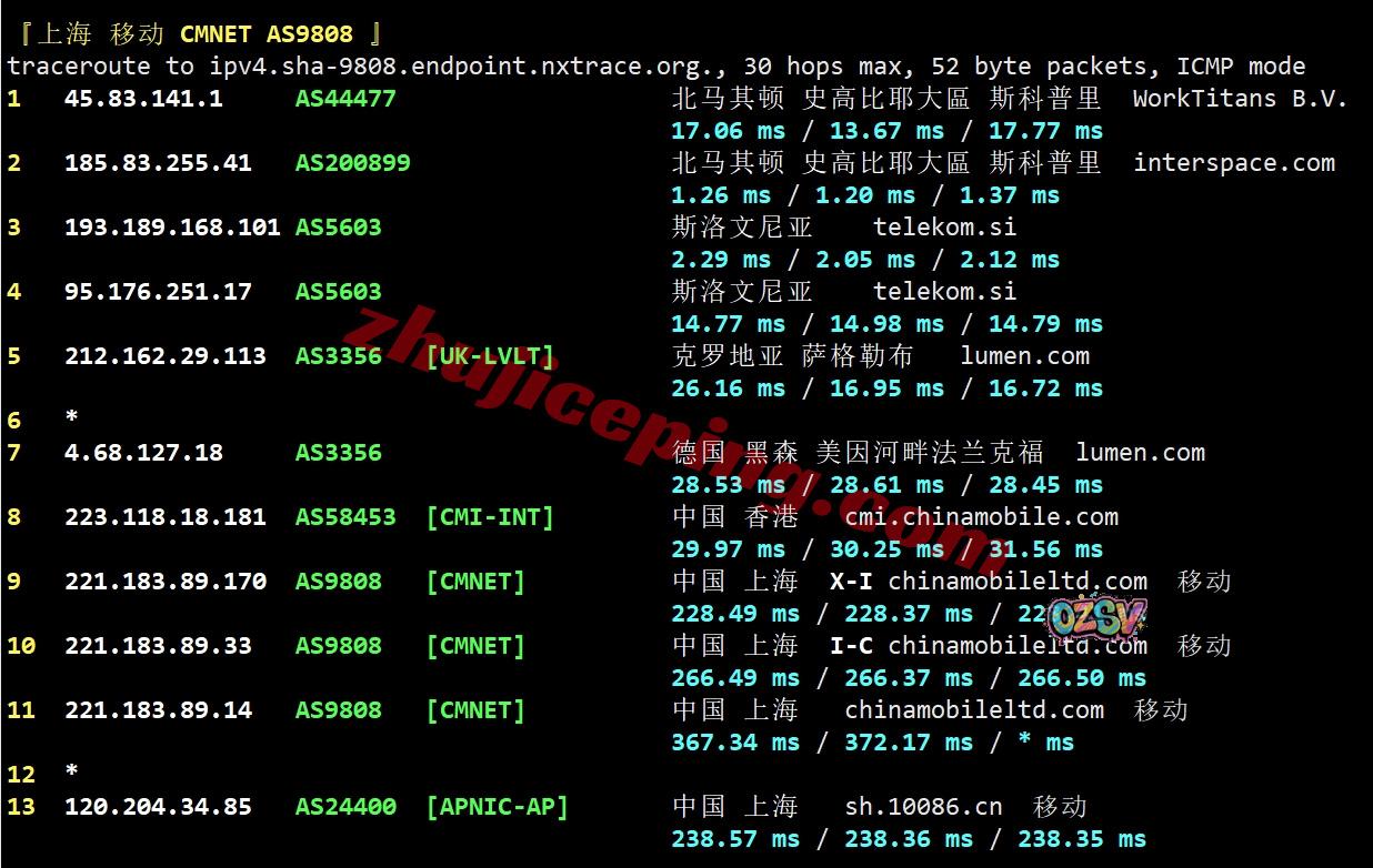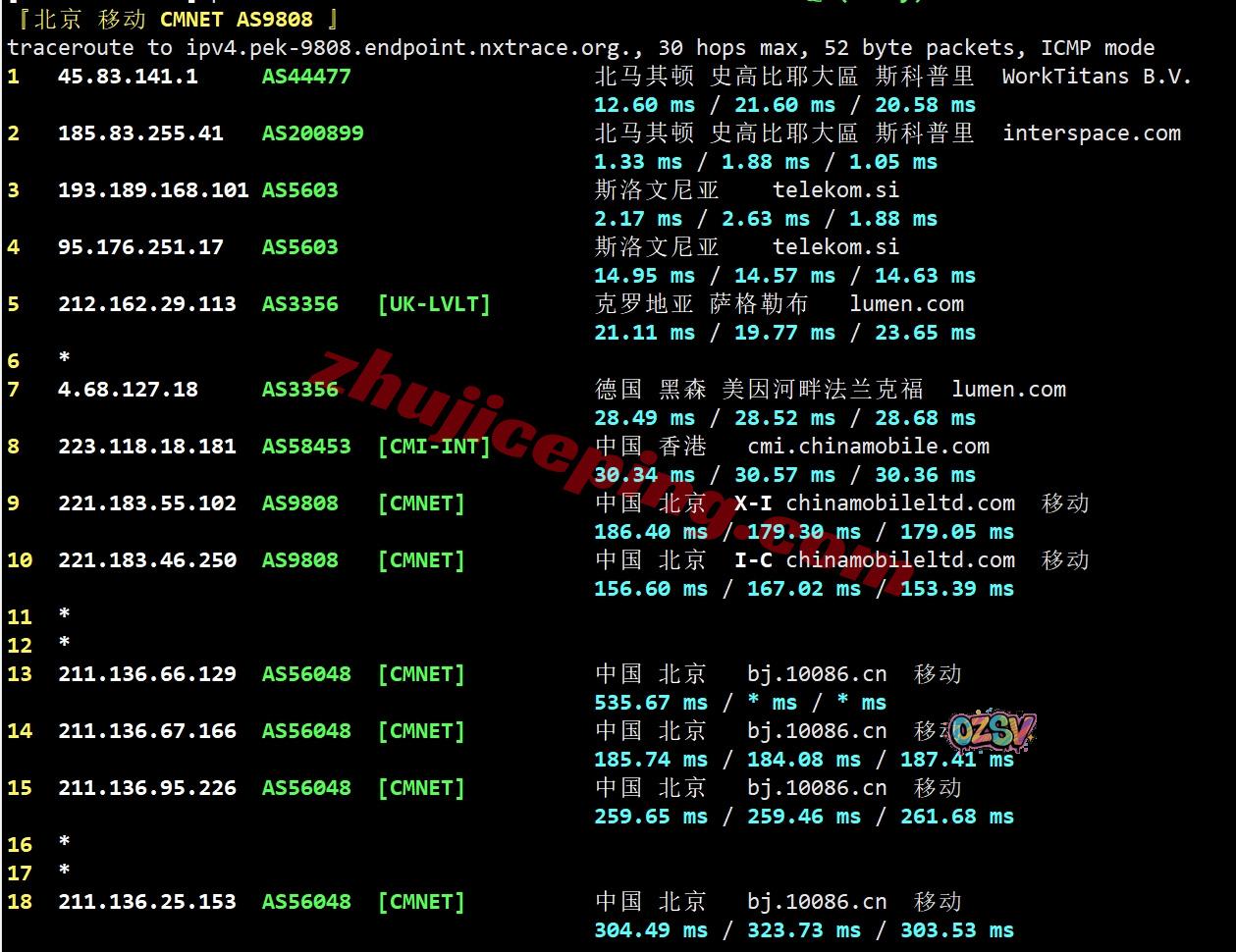 移动回程:走telekom经过斯洛文尼亚接level3到克罗地亚后去德国法兰克福后转移动CMI直连回国