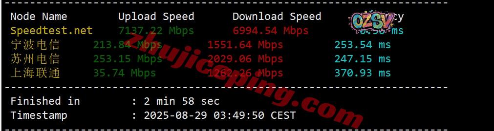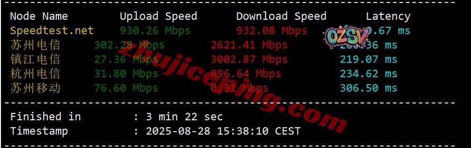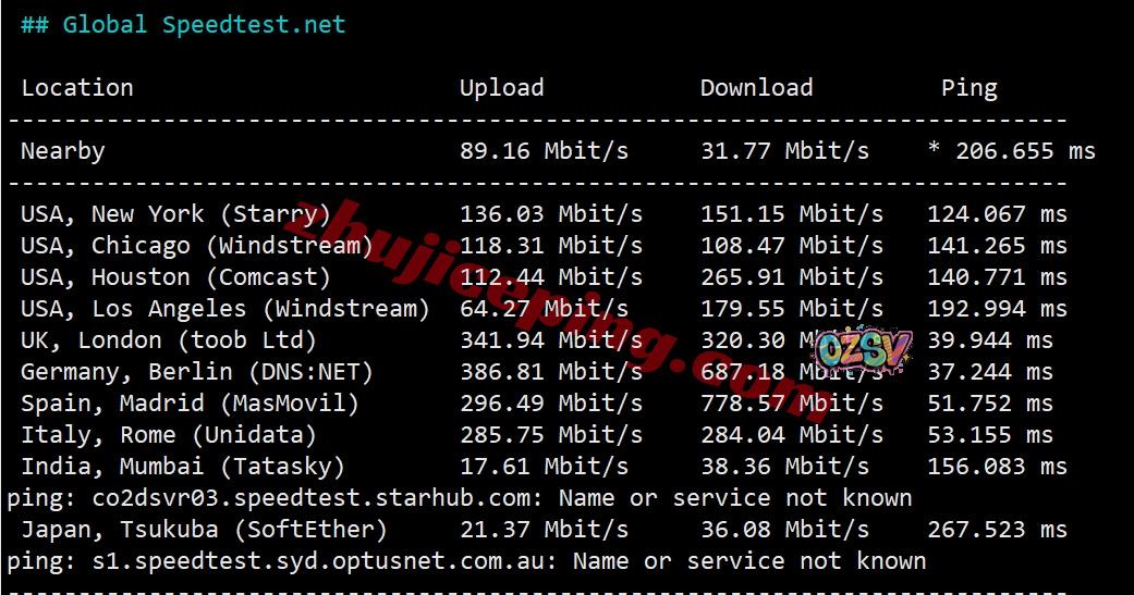 SpeedTest.Net的部分国际热门节点的带宽上下行测试数据如下: