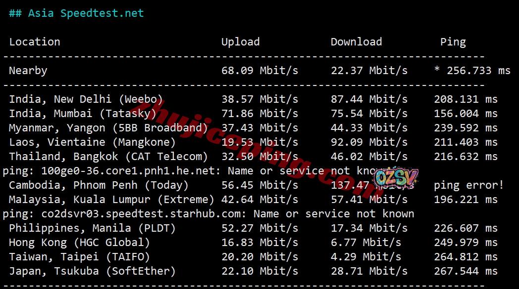 SpeedTest.Net的部分亚洲节点的带宽上下行测试数据如下: