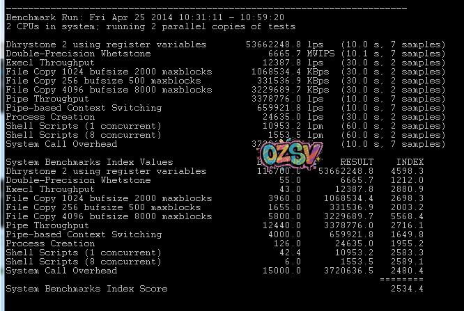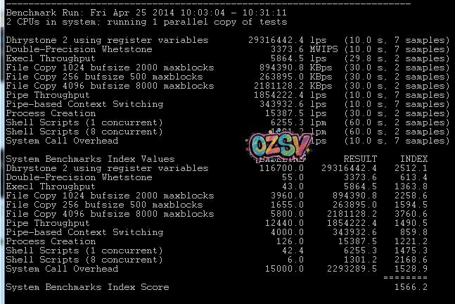 UNIXBENCH MARK,虽然有点儿变态,我觉得完全没有必要,但是为了让大家看看,我还是硬着头皮跑了几十分钟,结果如下:
