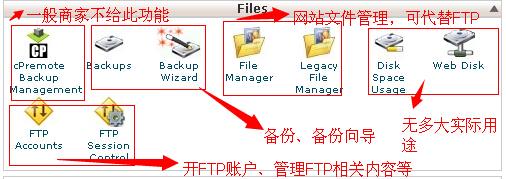 Files,文件管理,对网站打包、备份、单个文件修改、FTP创建管理都在下面图中有说明: