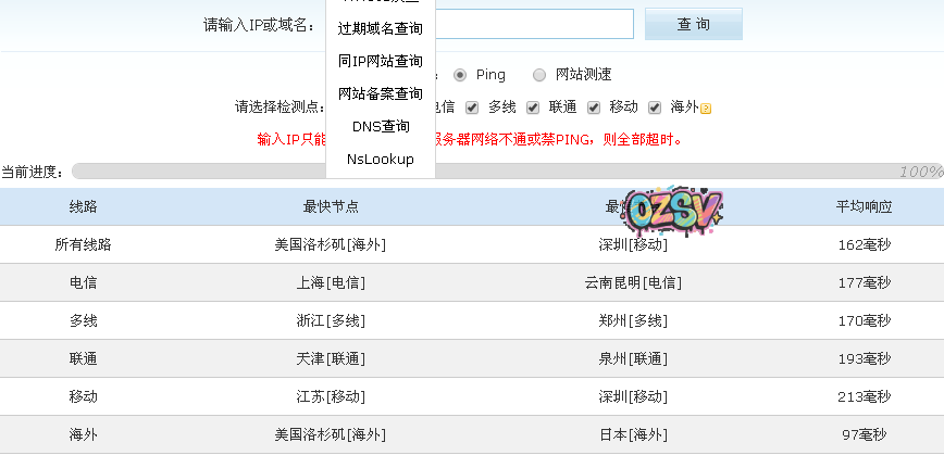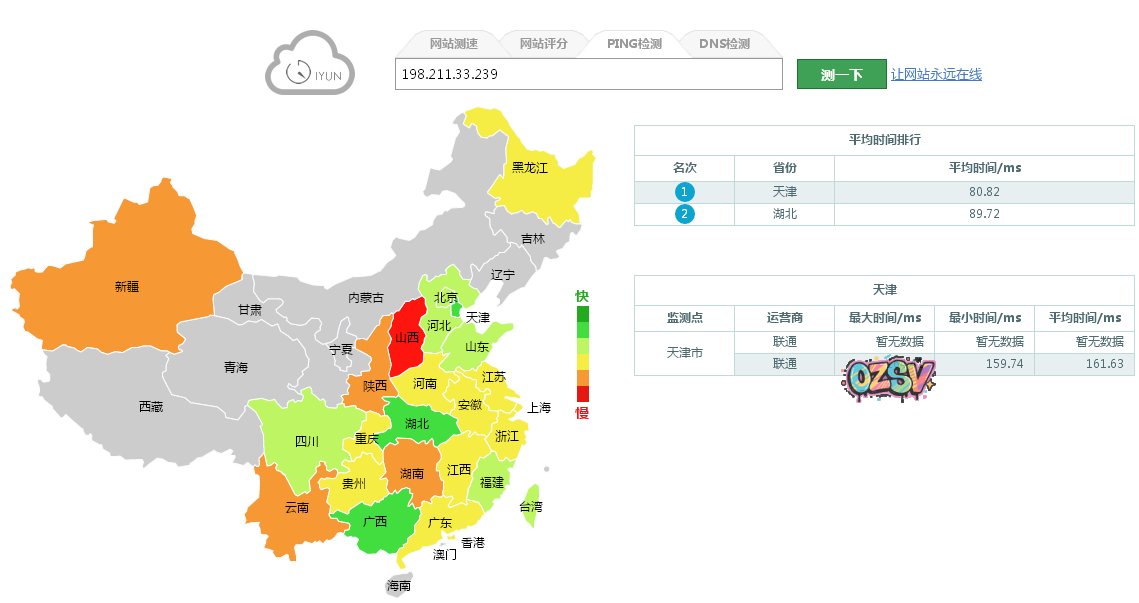 我们来看看国内测速网站的数据,我这里选chinaz和360做测试,全国接近90个节点,图片是截图,太宽我限制了宽度,大家复制图片链接查看原图:
