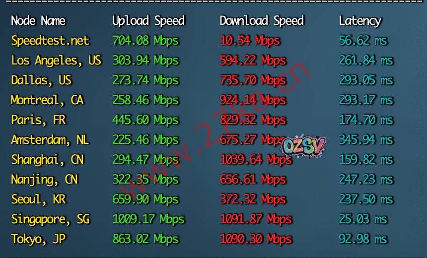 官方网站上面写的是默认是1Gbps带宽,我们直接用speedtest.net在中国大陆的三网的节点来做个带宽的上下行测试,看看可以跑到多少。数据如下,上行是1Gbps,下行是1Gbps:
