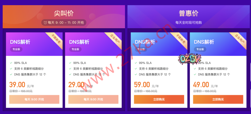 进入腾讯云DNS解析专业版促销活动页面后如下图直接下单即可,分为了企业用户和不限新老用户两种方案,下单时需要绑定域名,请自己填写好。另外“尖叫价”是限时优惠,没有讲到就普惠价格吧,真心不算贵。