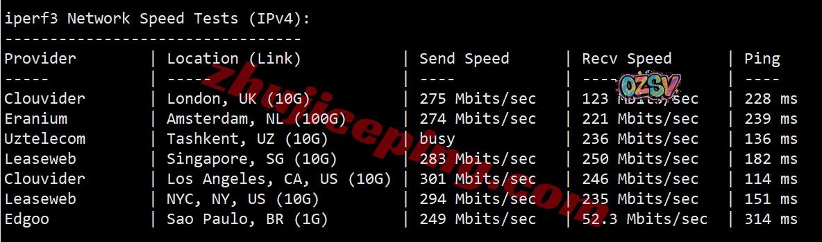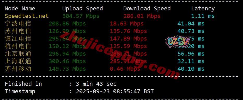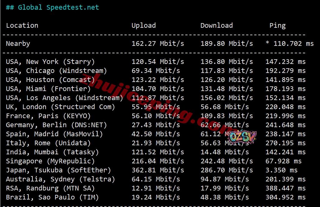 SpeedTest.Net的部分国际热门节点的带宽上下行测试数据: