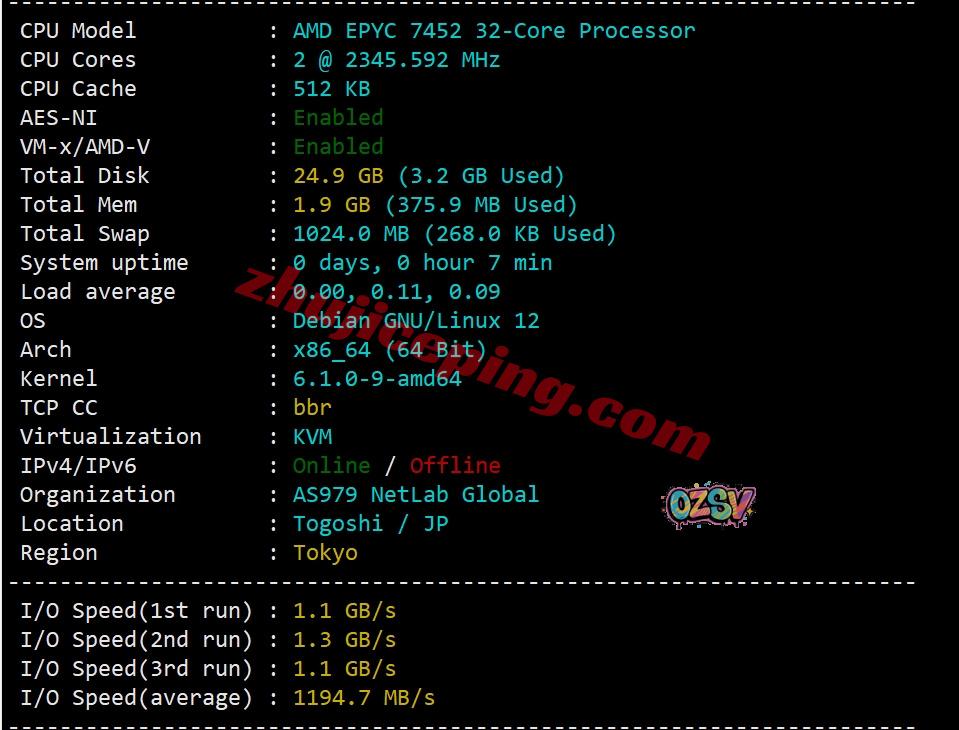 服务器采用的CPU型号为AMD EPYC 7452(属于7002系列,32核,64线程,主频2.35GHz,加速频率3.35 GHz ),底层为KVM虚拟,站长开启了BBR,不支持IPv6,上游网络提供商为netlab,归属地日本东京,当前I/O实测大致1194MB/S: