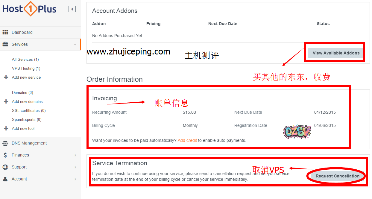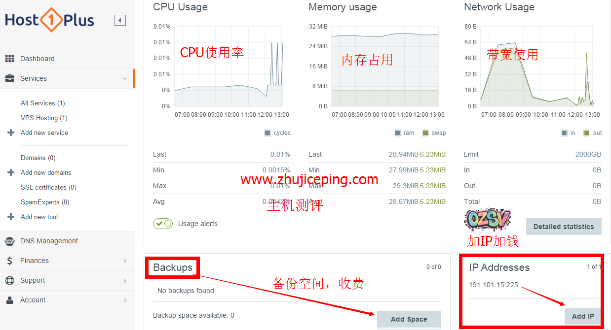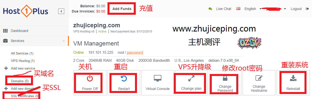 host1plus注册的时候我们发现使用的是WHMCS,和别人基本没有什么区别,VPS管理后台那是一个相当的精简,没有多余累赘的东西。