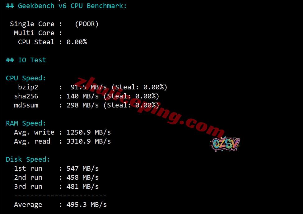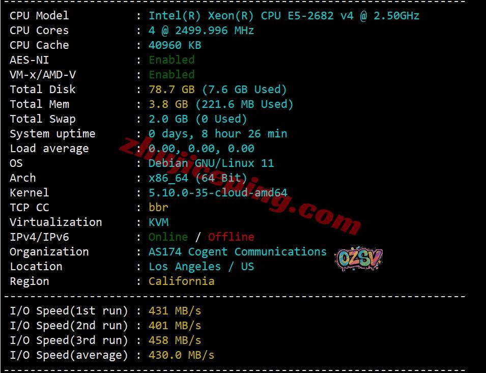 服务器用的CPU为双路e5-2682v4(32核、64线程、主频2.5GHz、加速频率3.0GHz),VPS底层为KVM虚拟,站长启用了BBR,不支持IPv6,看起来是cogent的IP广播的,当前I/O实测430MB/S: