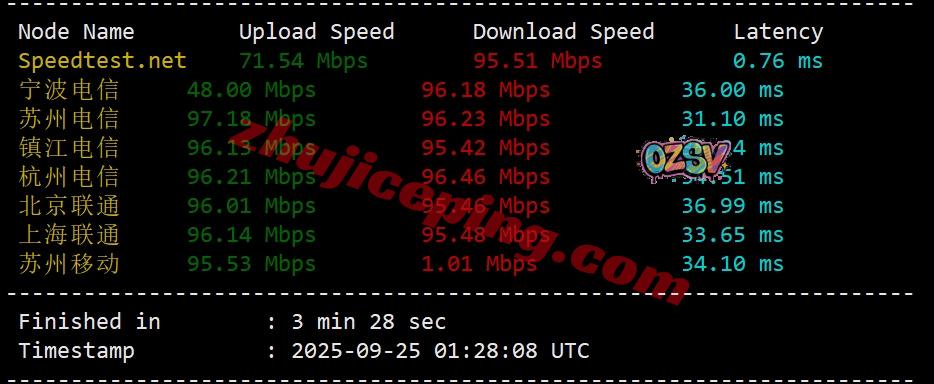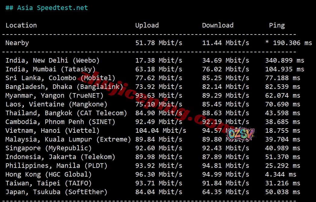 SpeedTest.Net的部分亚洲节点的带宽上下行测试数据: