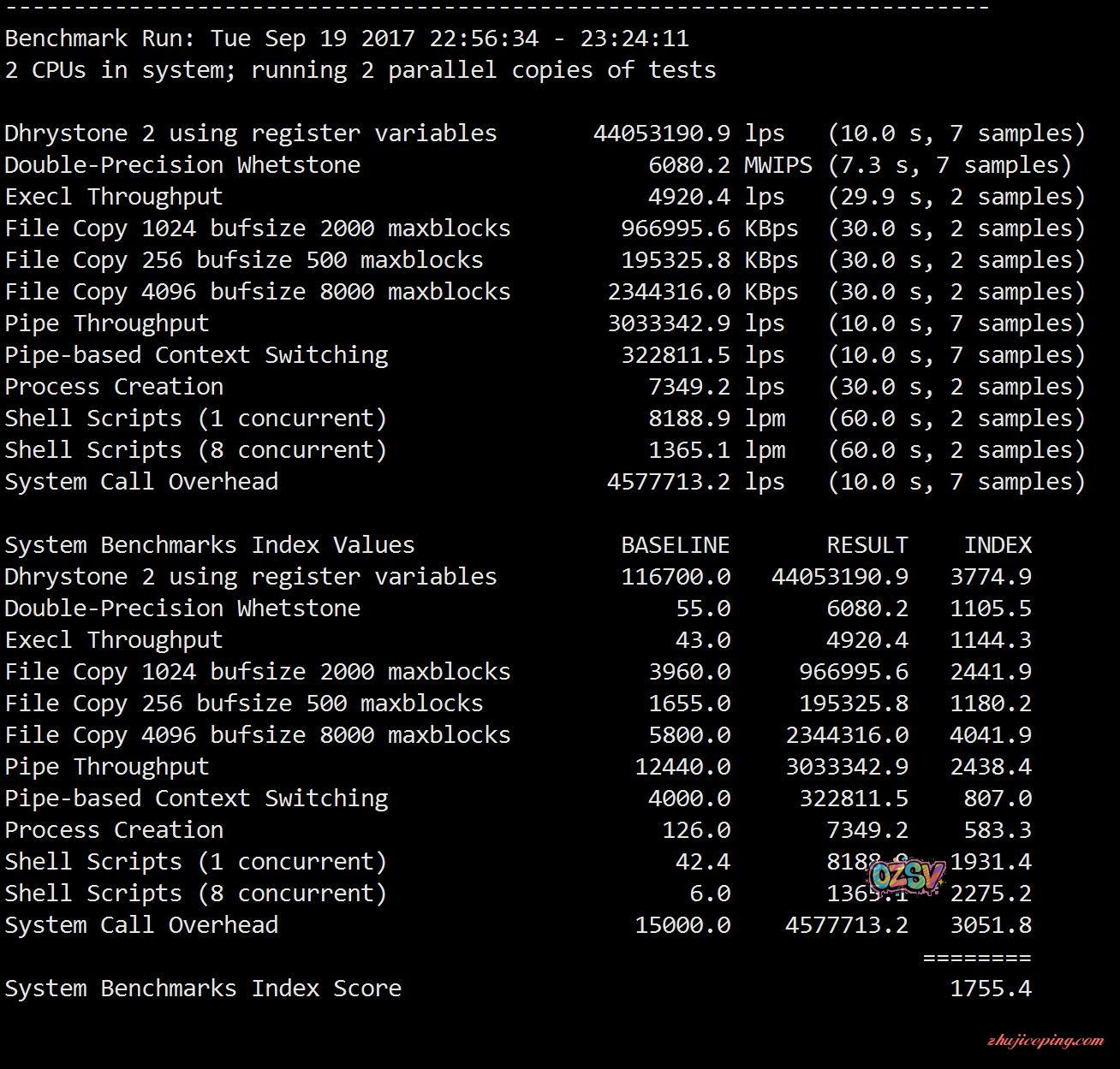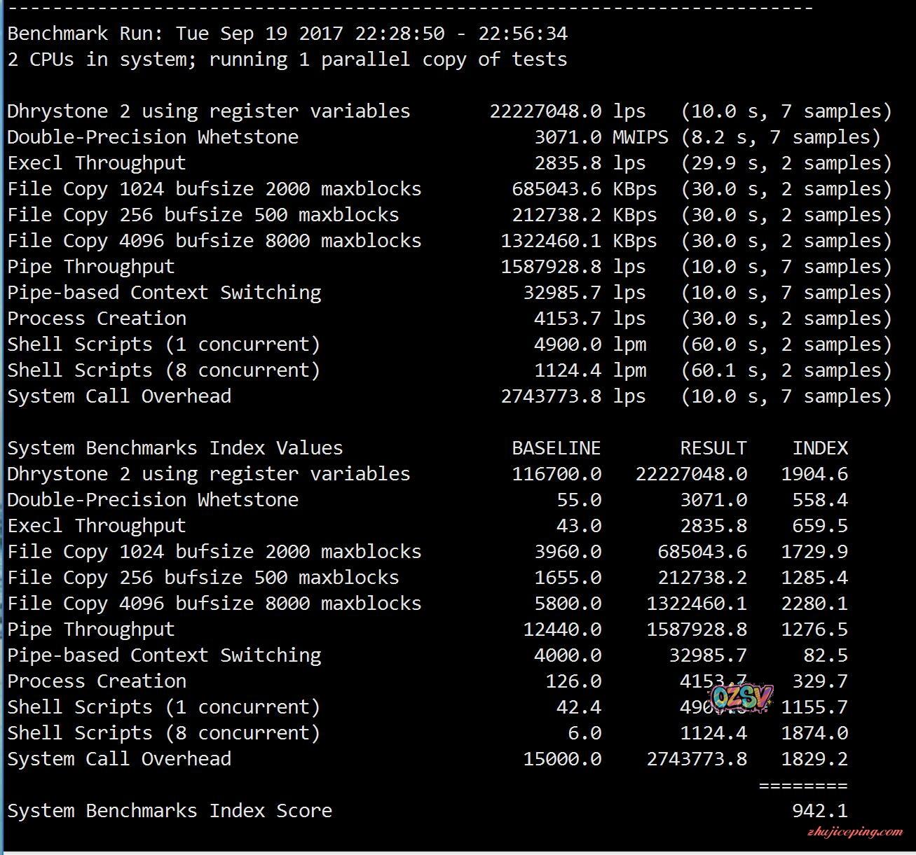 Unix bench 跑分,1核942,2核1755,中等偏上的样子: