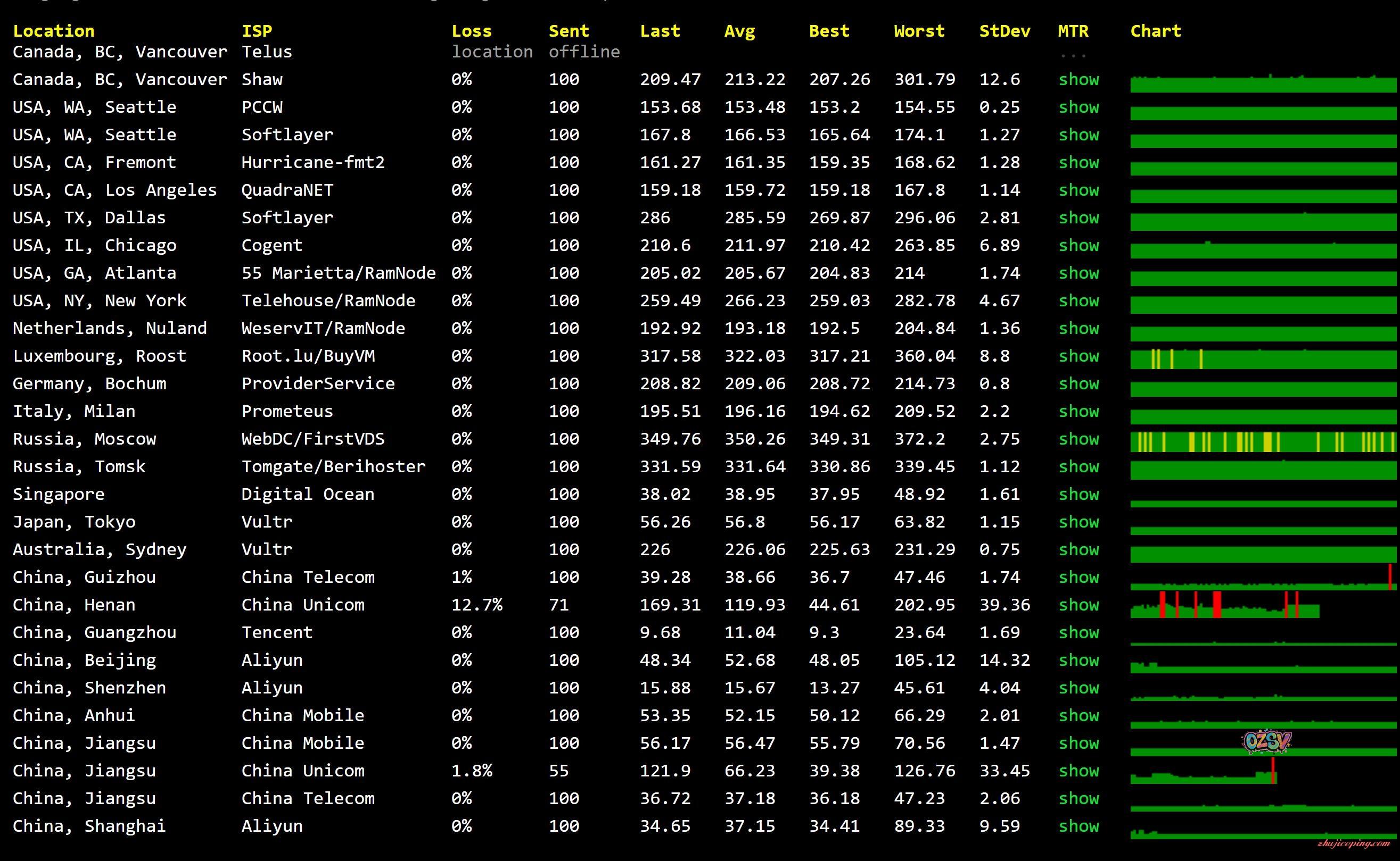 不着急,我们再来看看国内的电信、联通、移动测试的速度,CT(电信)、CU(联通)、CM(移动):
