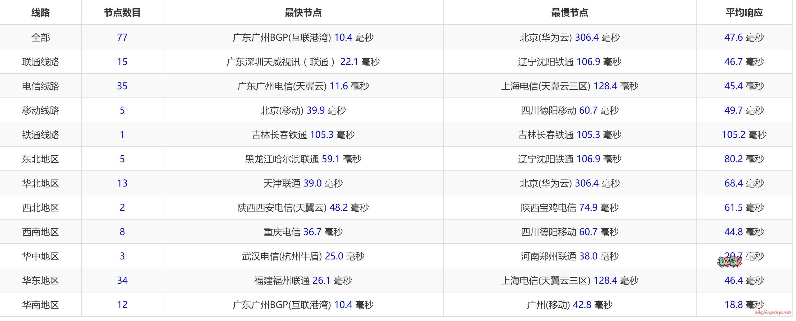 国内77个节点PING,平均值,分线路、分区域,大家仔细看看数据: