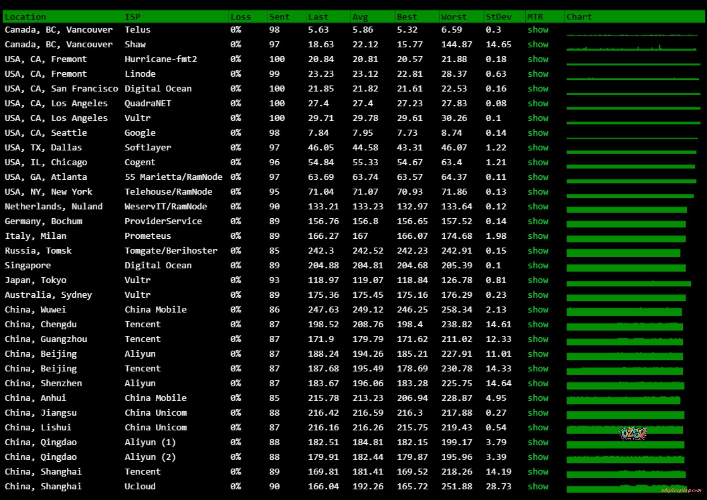 看看国内外的一些节点的大致PING的结果: