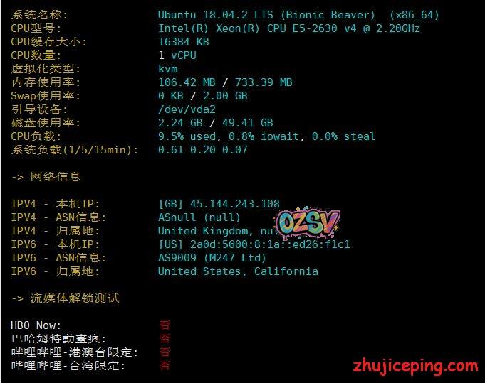 站长拿到的是768M内存、1核、50G SSD的VPS,IP是“Think-Huge-Ltd”也就是onevps母公司自己广播的,CPU为E5-2630v4(2.2G主频)