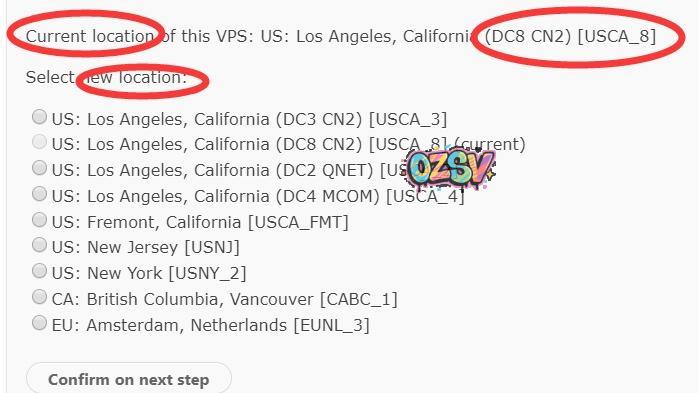 我们要切换去其他机房,在Select new location下面选一个自己喜欢的即可,选中,然后点击:“Confirm on next step”,接下来没你什么事儿了,等他完成会给你邮件通知,你可以关闭网页了!