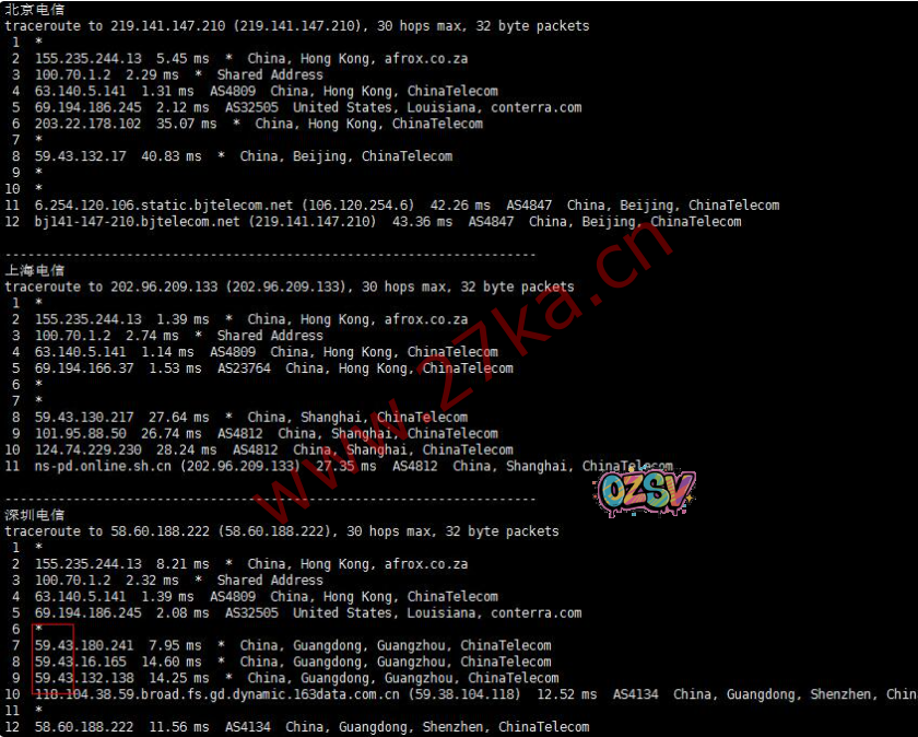 我们下面来看看香港服务器三网去程和回程路由情况。