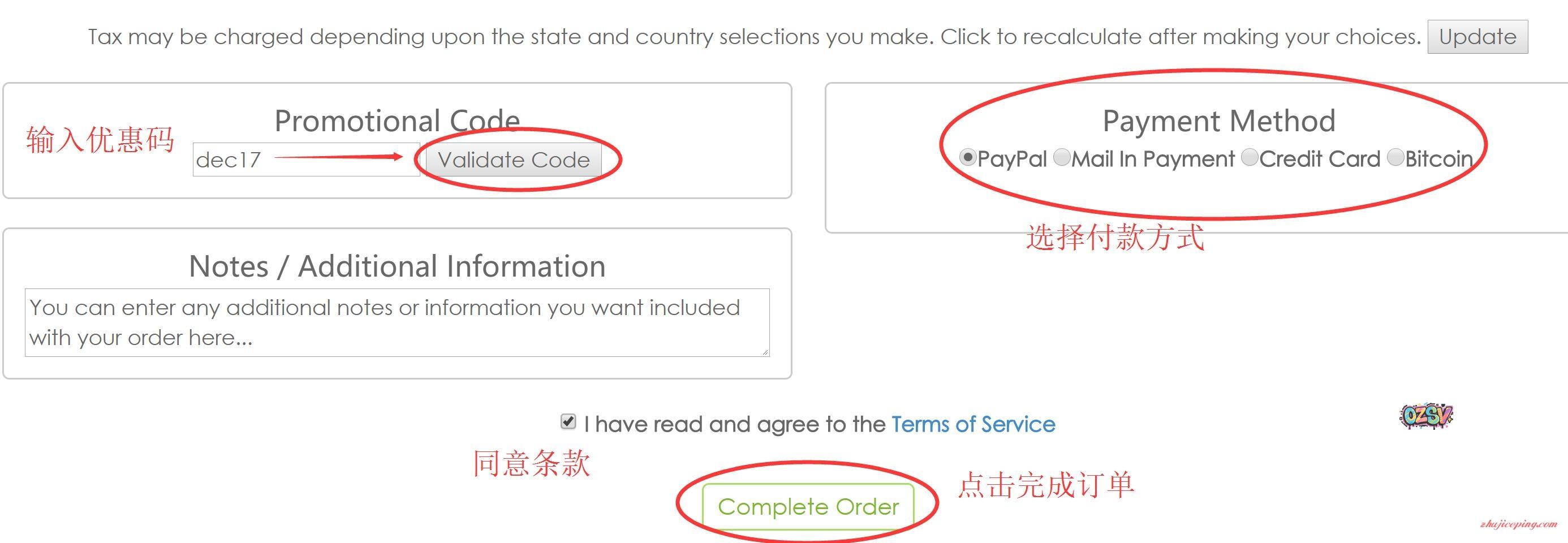 输入优惠码,选择付款方式,同意条款,点击完成订单: