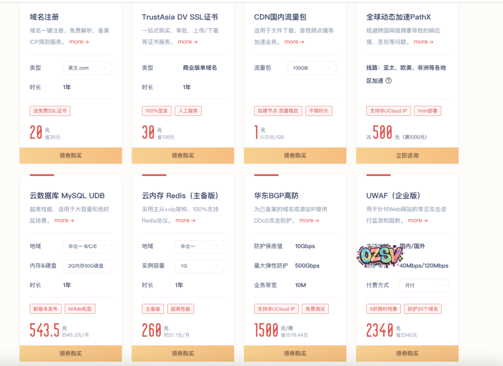 针对域名、SSL证书、云数据库、云内存、CDN、PathX、高防、UWAF等云周边产品,本次夏季钜惠推出必备云产品普惠板块,英文.com域名注册首年20元或英文.cn域名注册首年10元, TrustAsia DV SSL证书30元(原价168元),不限有效期CDN流量包100G仅1元,活动不限新老用户,以上产品可各领券1次进行购买。