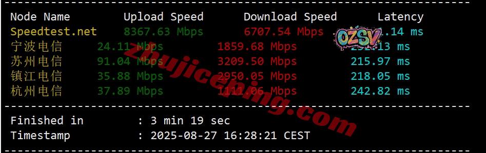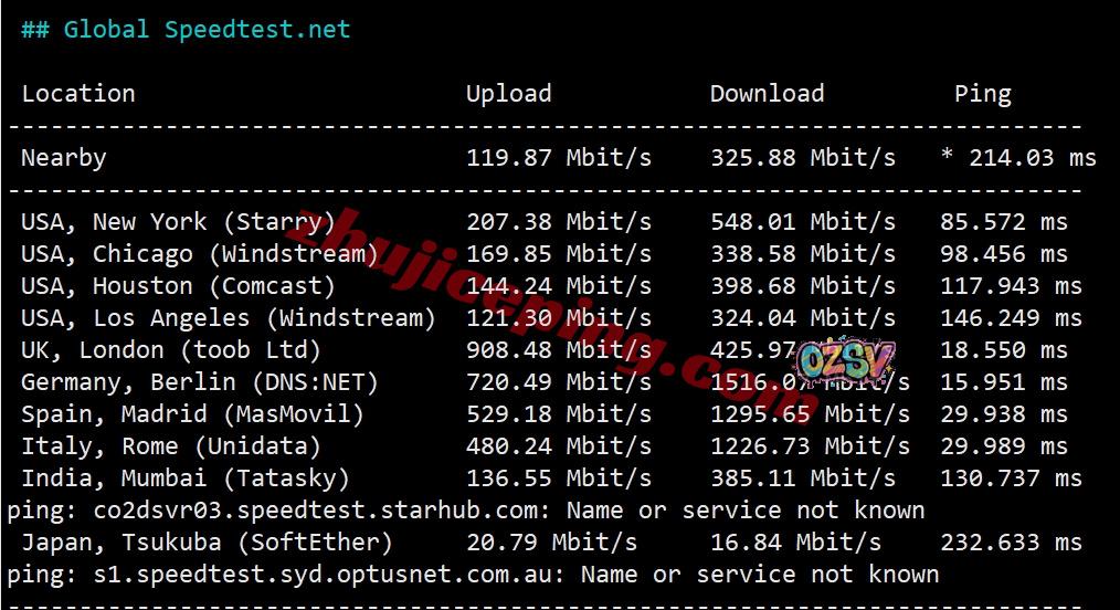 SpeedTest.Net的部分国际节点的带宽上下行测试数据: