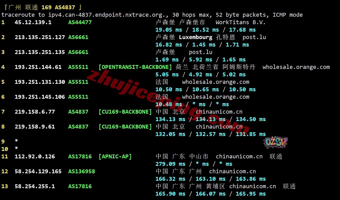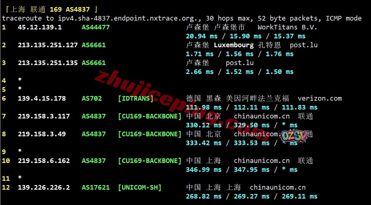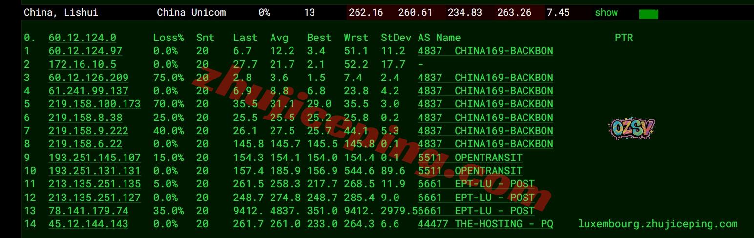 联通去程:直连联通德国法兰克福节点,然后接orange去比利时再接post.lu到卢森堡
