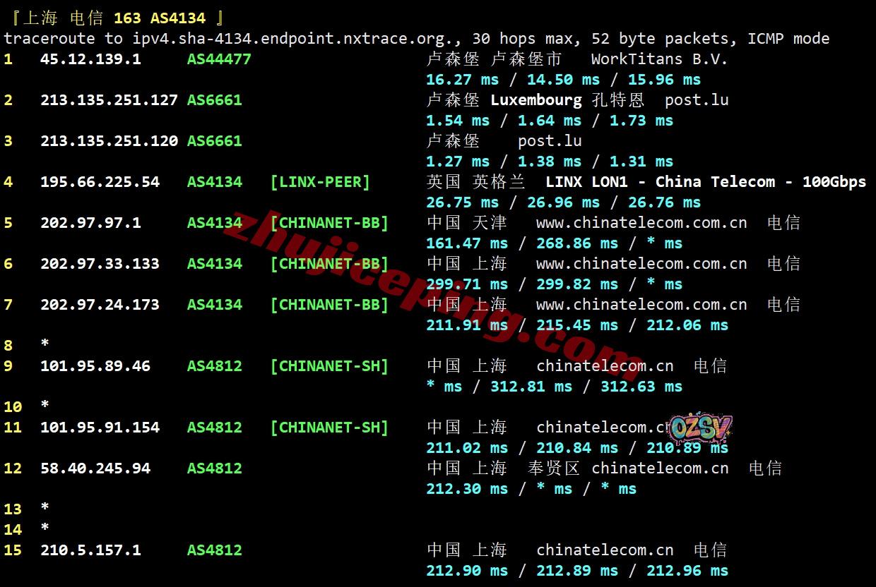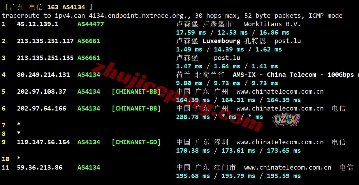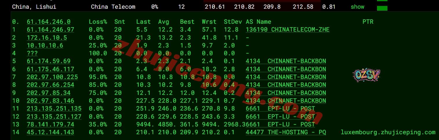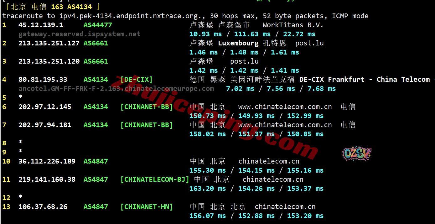电信回程,先走post.lu到德国/荷兰/荷兰然后从当地电信节点直连回国;