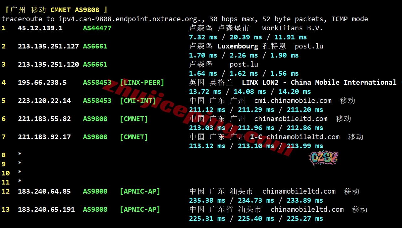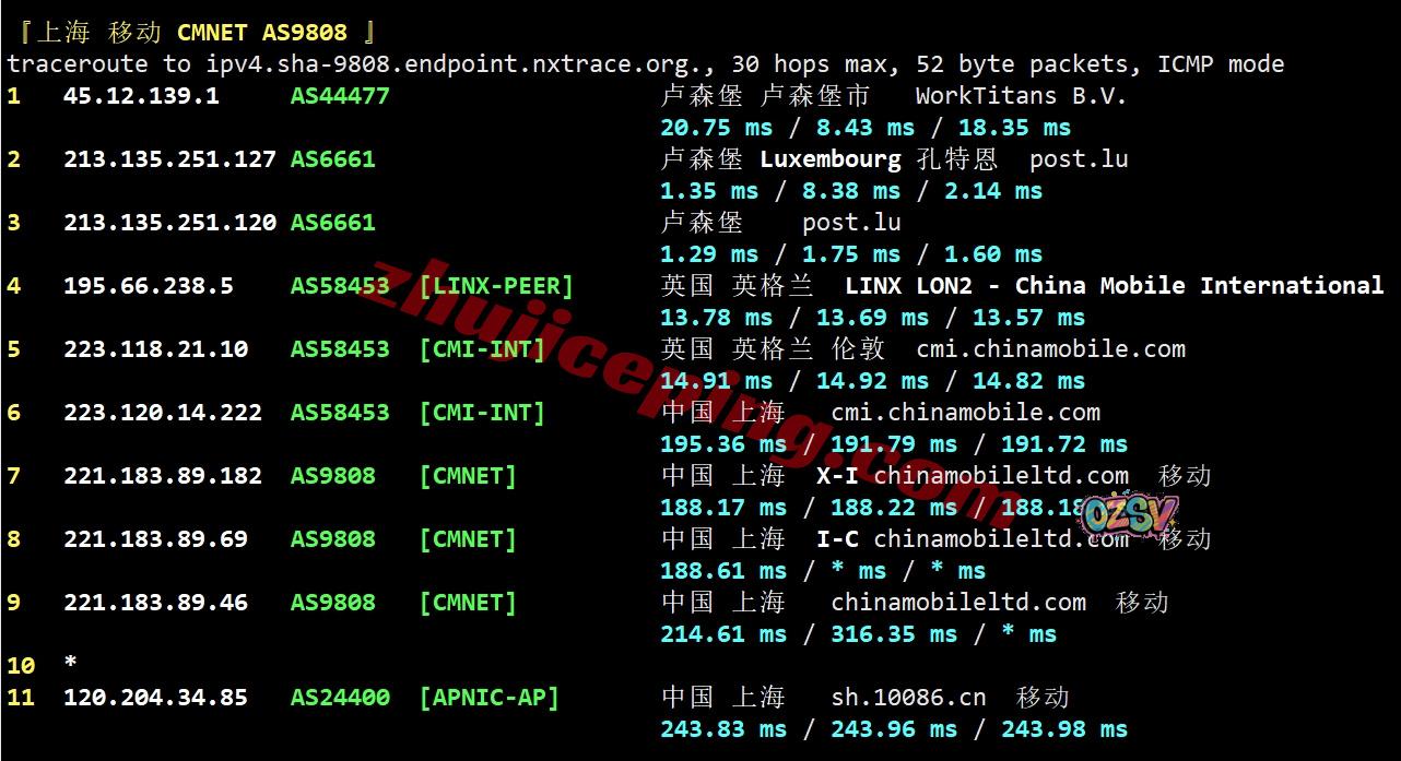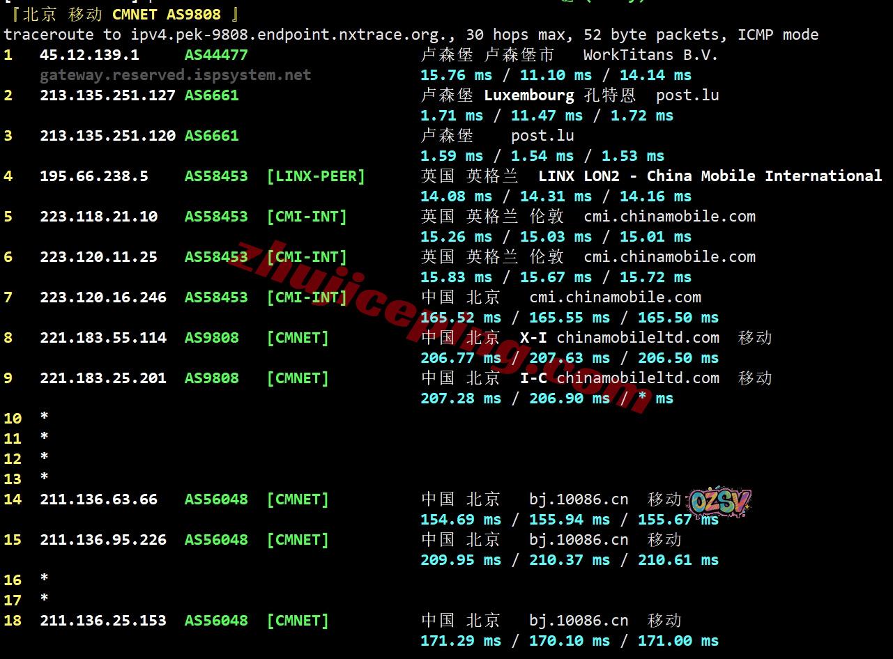 移动回程,先post.lu到英国,然后从移动伦敦CMI节点直连回国;