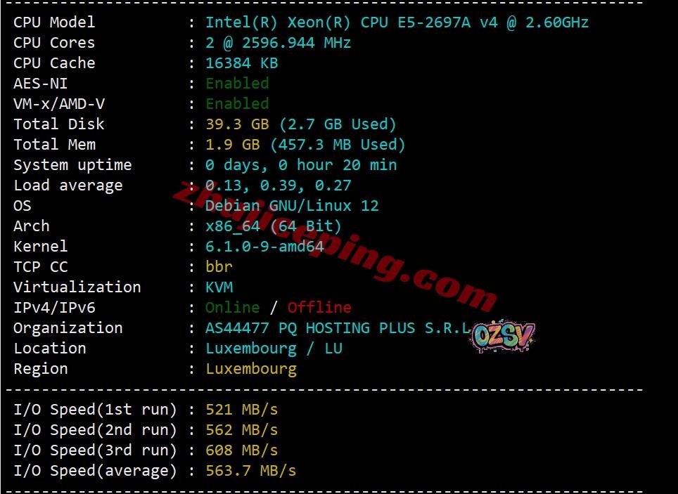 服务器用的CPU型号为2*e5-2697A V4(32核、64线程、主频2.6GHz、加速3.6GHz),底层为KVM虚拟,站长启用了BBR,不支持IPv6,上游网络提供商实际上就是他自己(the.hosting就是原来的pq.hosting),归属地为卢森堡,当前实测I/O大致在563MB/S: