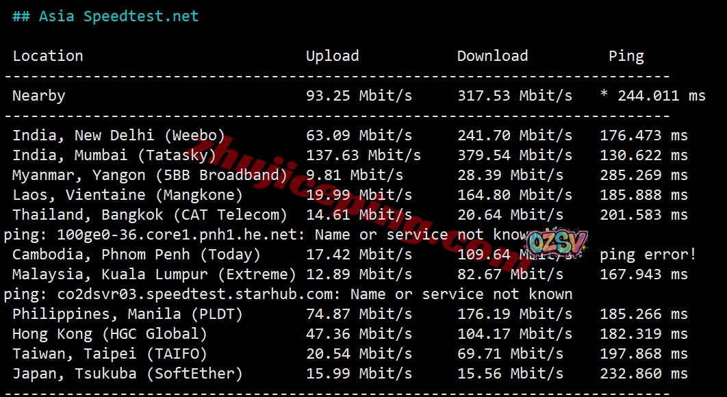 SpeedTest.Net的部分亚洲节点的带宽上下行测试数据: