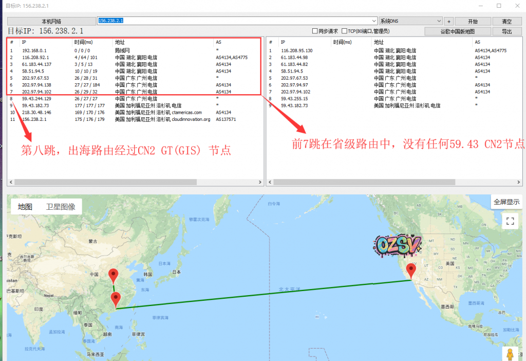 1、下图是美国洛杉矶CN2 GT线路,以美国CN2 GT线路的 IP 156.238.2.1为例,襄阳电信追踪美国CN2的IP,中国大陆内:襄阳到广州的路由全部由202.97的163骨干网承载,在省级路由中没有任何59.43的CN2节点,仅在出海时进入CN2节点,也就是在图中的第八跳才出现CN2节点59.43的路由,这就是典型的CN2 GT线路