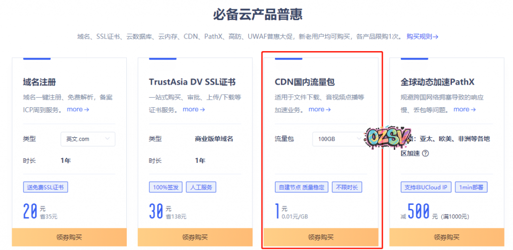 如果对UCloud云分发CDN有需求去,目前可以去UCloud全球大促活动页面必备云产品普惠专题参与活动,此活动当中有100GB/5TB/50TB三种规格的CDN国内流量包代金券,其中1元/100GB、580元/5TB和5060元/50TB。几个套餐只能任选其一,大家可以根据自己业务需求来,选择套餐,毕竟大折扣力度产品只有一次选择的机会!