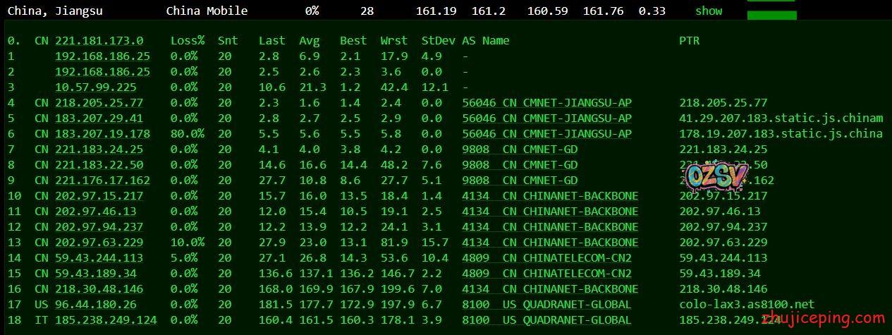MTR看来,电信应该效果最好,往返都过了5943;移动最奇葩,来去都是走的别人的;联通直连还凑合!