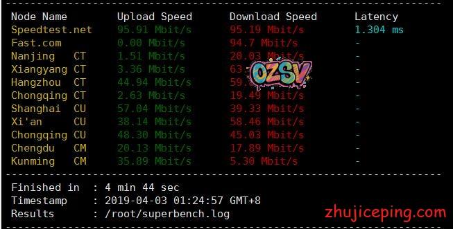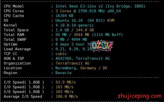 惊喜不惊喜,E3的小母鸡啊,IP地址看出来就不是原生的了,I/O是100MB/s的样子!这与我在官方得到的消息一致,每个VPS都很公平,限制100M的I/O!