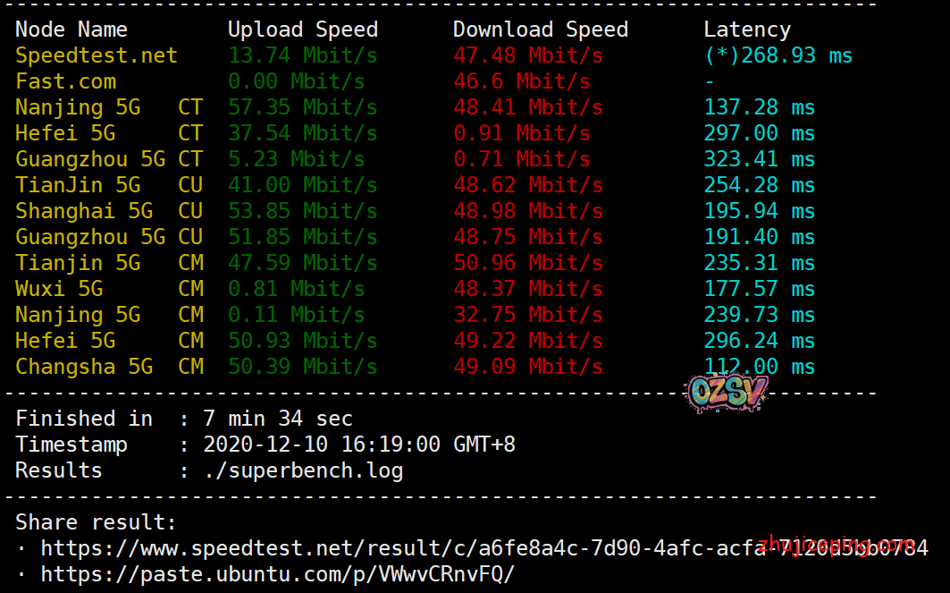 官方的配置上面写的是50Mbps带宽,国内实测确实是有的,电信、联通、移动都有节点能跑到这个水准: