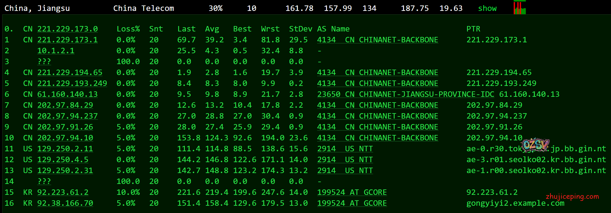 国内三网去程,这里用的江苏的电信、联通、移动测试的:
