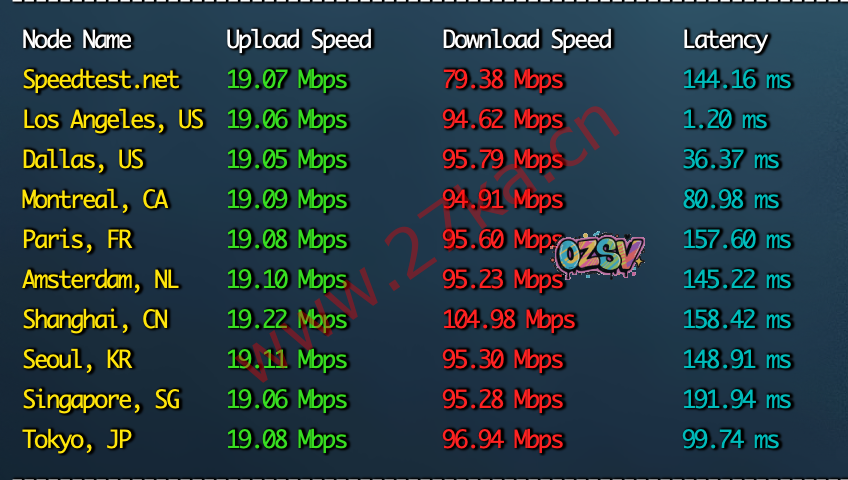 官方网站上面写的是默认是20Mbps带宽,我们直接用speedtest.net在中国大陆的三网的节点来做个带宽的上下行测试,看看可以跑到多少。数据如下,上行是20Mbps,下行是100Mbps: