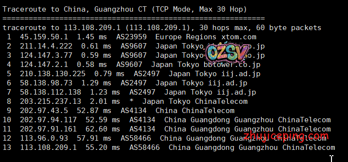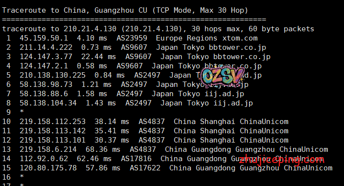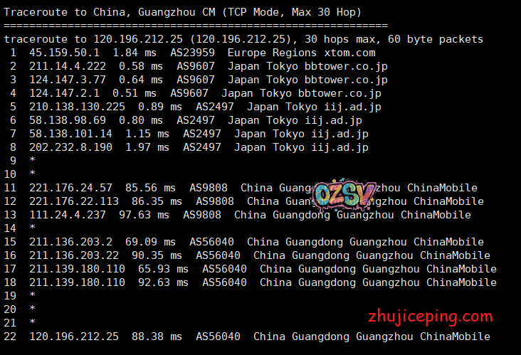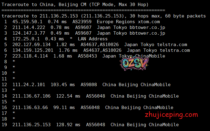 回程,到中国移动,机房出来之后,北京这边走的是Telstra,广州这边貌似走的是iij,也都是直连: