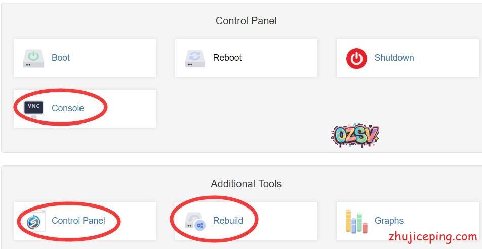 Console(VNC)、“Control Panel”这就是solusvm可以直接点击进入、“rebuild”可以直接重装系统