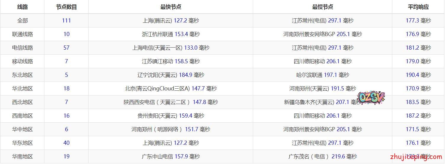 国内111个节点的PING,平均177毫秒,最低127毫秒,最高最高297毫秒: