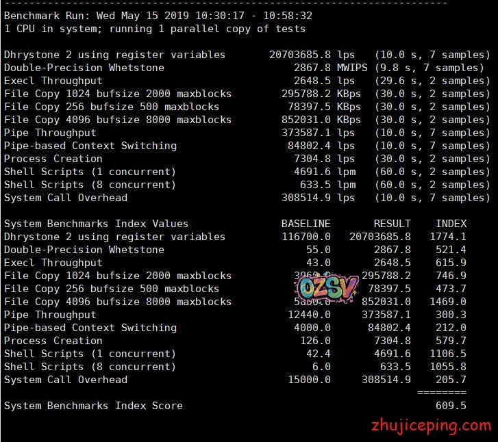 然后跑个分,609,单核,中等吧: