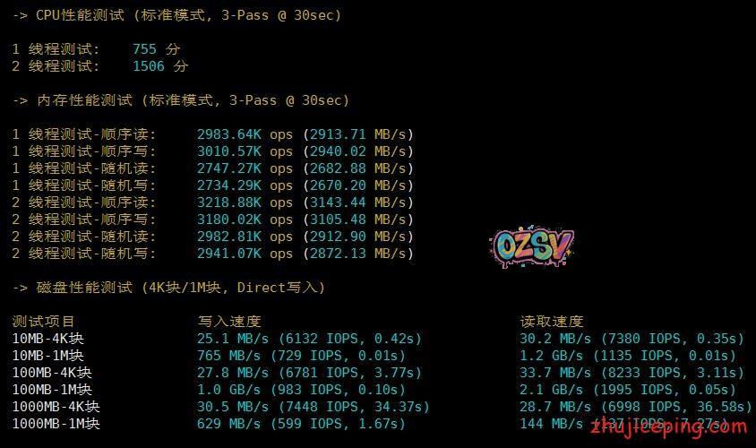 看下硬盘的4K写入速度,大致在一个中等水准,这与服务器本身的硬盘读写负载有一定的关系: