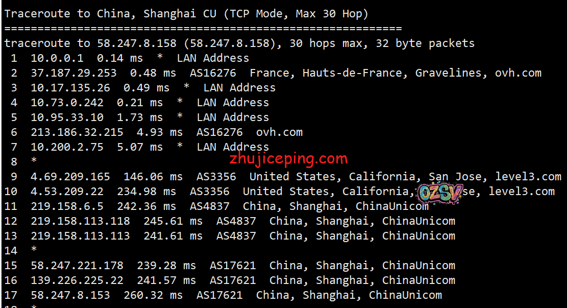 上海方向:法国到美国圣何塞走level3后走AS4837回来
