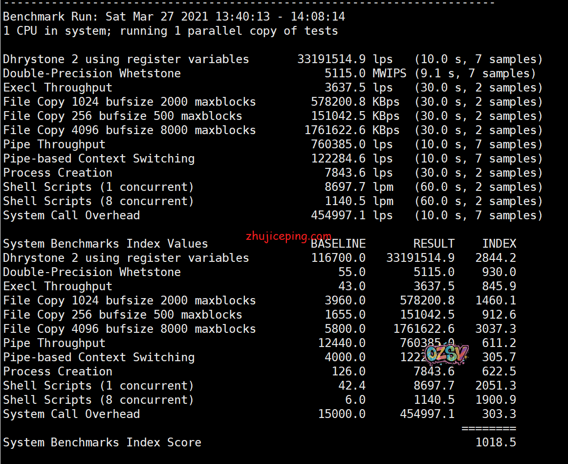 单核,Unix bench Mark 1018,还行吧: