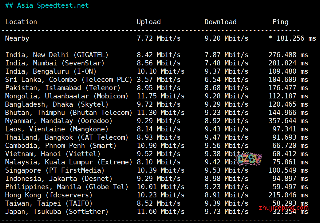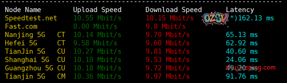 国内多借点测试VPS的上行带宽、下行带宽,从数据来看基本上是跑满10Mbps的: