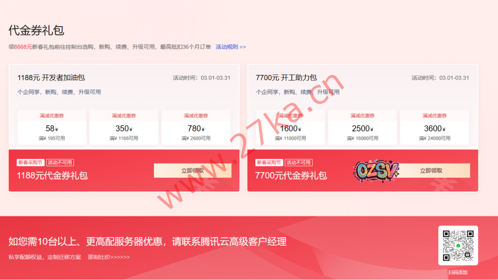 活动商品较多,除了上面列出外,还有轻量服务器买1年送3个月,香港云服务器境外云服务器等,这个券我估计大多数跟我一样的是没法薅了,个企同享最低满11000减1600,如果是开发者倒是可以领取最低满195减58元券。