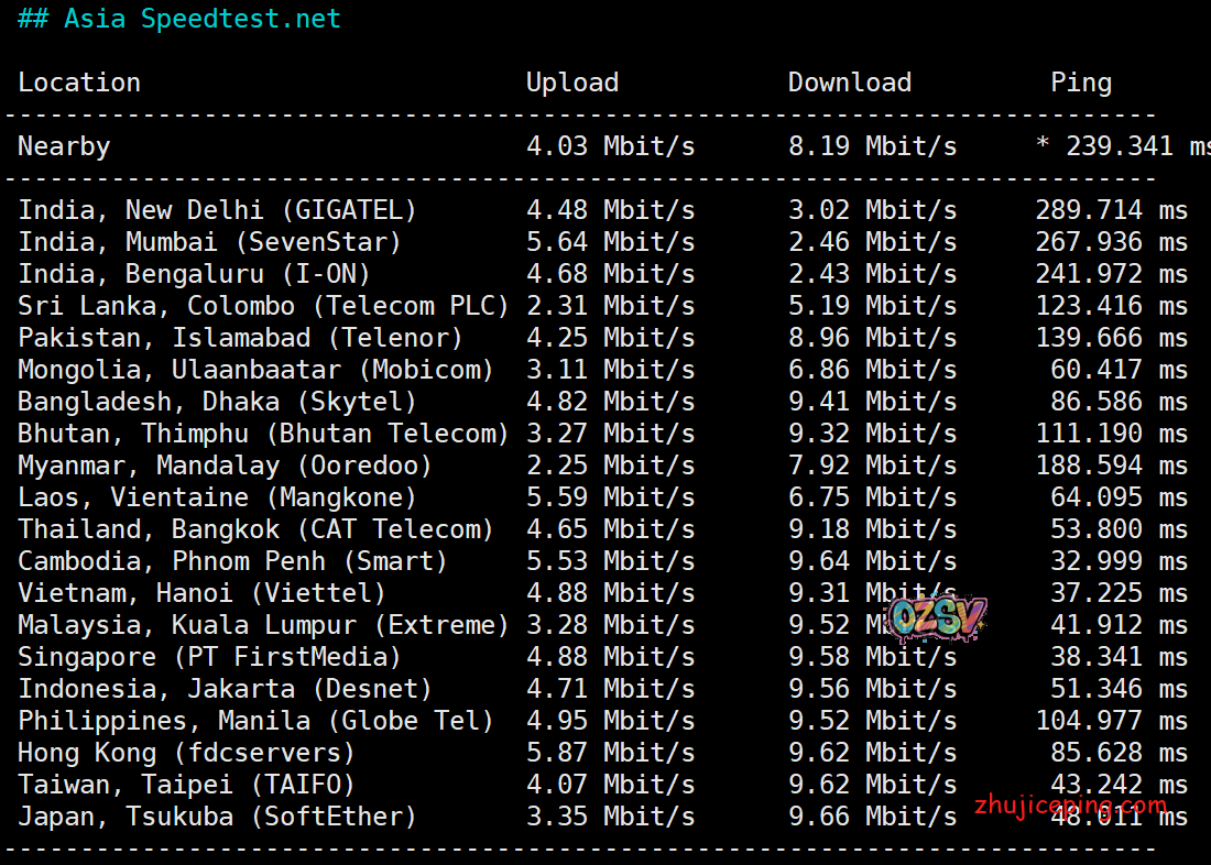 亚洲区域内的国家和地区测试,上行依旧是5Mbps左右,下行也是差不多10Mbps: