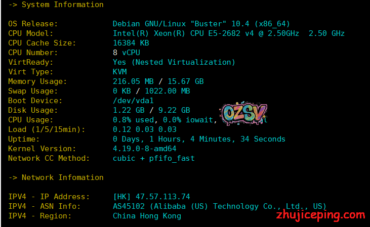 官方给站长提供了一个香港阿里云网络的VPS,用来测试的,说一下这个测试的VPS是100Mbps带宽的,安装的debian系统,没开BBR等任何优化加速。